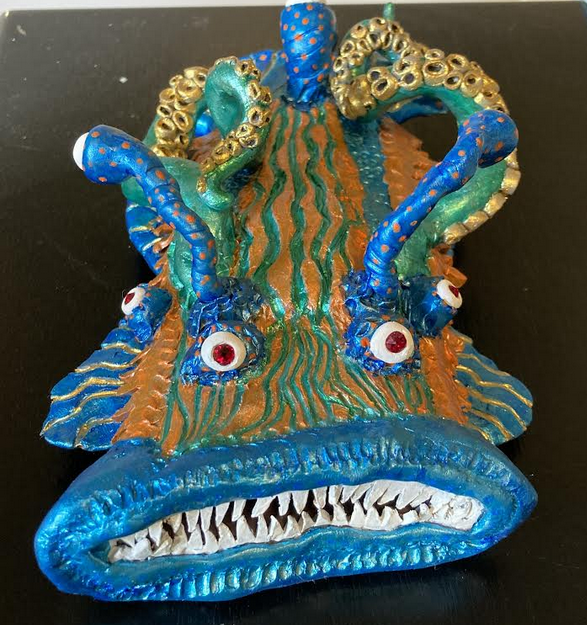 Carpet Sharktopus. Mixed Media Sculpture (Cosclay, acrylic eyes). This happened because of a photo of a carpet shark and I wondered what added eyes and tentacles would look like.